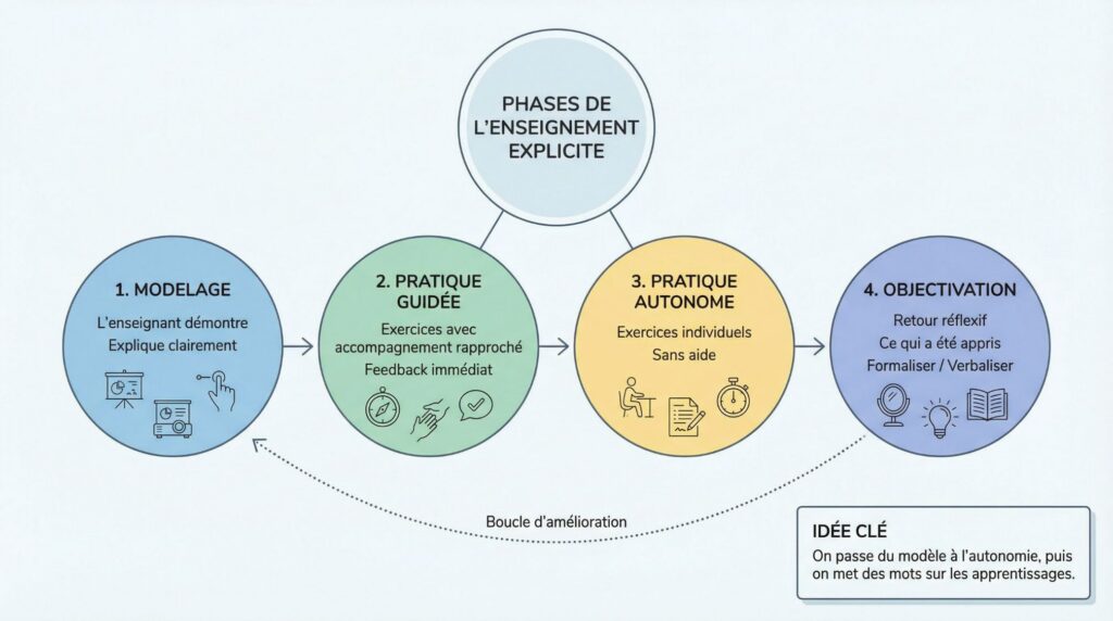 Pour l’apprentissage de nouvelles notions, l’enseignement explicite bénéficie généralement à tous les élèves, y compris aux élèves performants. C’est une approche que nous privilégions dans nos ateliers d’accompagnement, car elle permet de structurer l’apprentissage tout en maintenant l’élève actif et engagé.